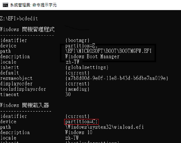 - 在命令提示字元中,輸入以下命令“bcdedit”然後按Enter鍵來查看系統安裝磁碟機位置。